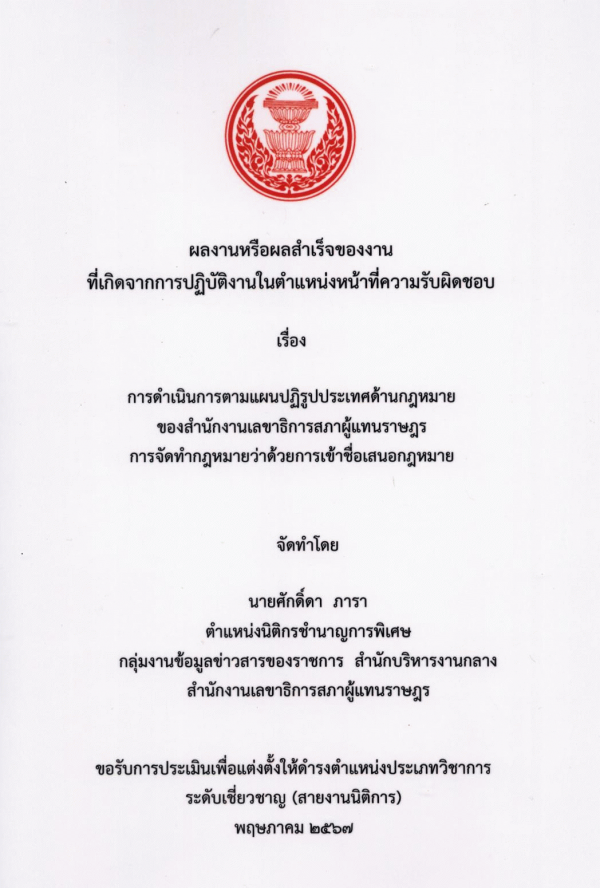 การดำเนินการตามแผนปฏิรูปประเทศด้านกฎหมาย ของสำนักงานเลขาธิการสภาผู้แทนราษฎร การจัดทำกฎหมายว่าด้วยการเข้าชื่อเสนอกฎหมาย / ศักดิ์ดา ภารา.