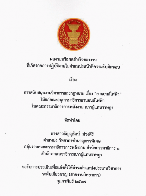 การสนับสนุนงานวิชาการและกฎหมาย เรื่อง "ยานยนต์ไฟฟ้า" ให้แก่คณะอนุกรรมาธิการยานยนต์ไฟฟ้า ในคณะกรรมาธิการการพลังงาน สภาผู้แทนราษฎร / ธัญญรัตน์ ม่วงศิริ.
