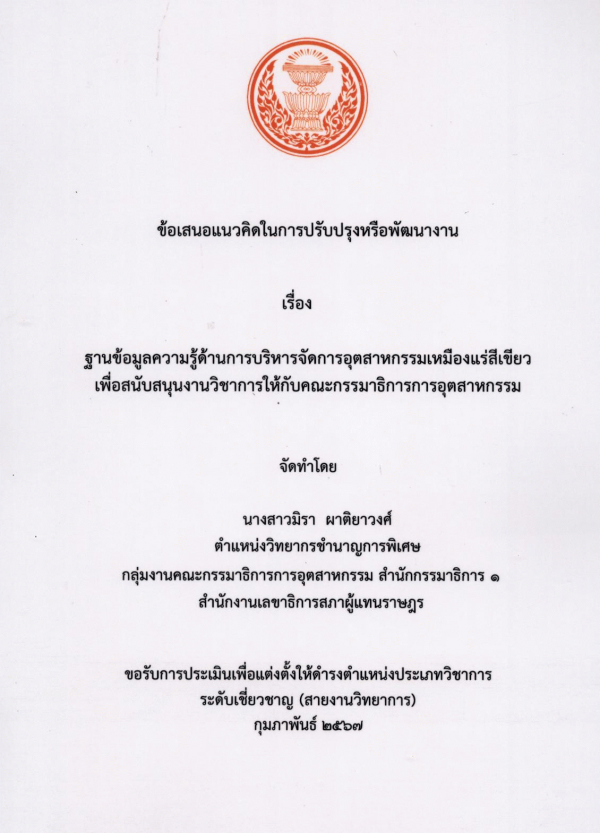 ฐานข้อมูลความรู้ด้านการบริหารจัดการอุตสาหกรรมเหมืองแร่สีเขียว เพื่อสนับสนุนงานวิชาการให้กับคณะกรรมาธิการการอุตสาหกรรม / มิรา ผาติยาวงศ์.