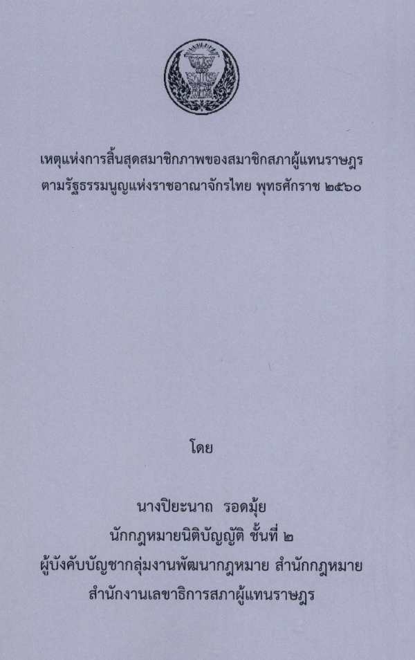 เหตุแห่งการสิ้นสุดสมาชิกภาพของสมาชิกสภาผู้แทนราษฎร ตามรัฐธรรมนูญแห่งราชอาณาจักรไทย พุทธศักราช 2560 / ปิยะนาถ รอดมุ้ย.