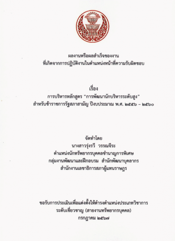 การบริหารหลักสูตร "การพัฒนานักบริหารระดับสูง" สำหรับข้าราชการรัฐสภาสามัญ ปีงบประมาณ พ.ศ. 2556 - 2560 / รุ่งรวี วรรณจีระ.