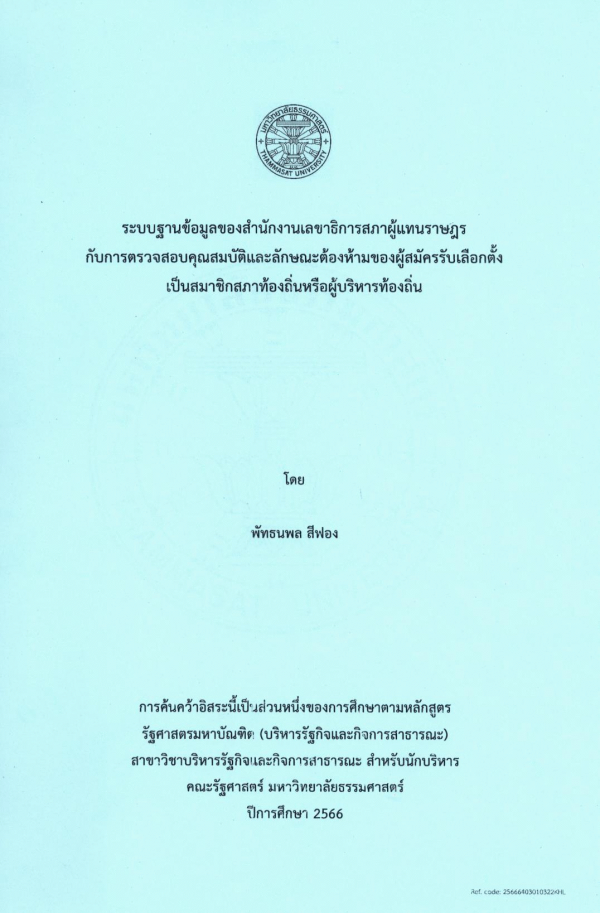 ระบบฐานข้อมูลของสำนักงานเลขาธิการสภาผู้แทนราษฎรกับการตรวจสอบคุณสมบัติและลักษณะต้องห้ามของผู้สมัครรับเลือกตั้งเป็นสมาชิกสภาท้องถิ่นหรือผู้บริหารท้องถิ่น โดย พัทธนพล สีฟอง / พัทธนพล สีฟอง.