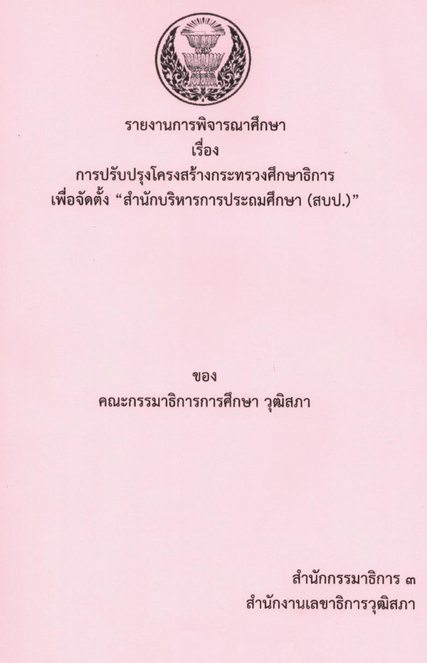 รายงานการพิจารณาศึกษา เรื่อง การปรับปรุงโครงสร้างกระทรวงศึกษาธิการ เพื่อจัดตั้ง "สำนักบริหารการประถมศึกษา (สบป.)" ของ คณะกรรมาธิการการศึกษา วุฒิสภา / สำนักกรรมาธิการ 3 สำนักงานเลขาธิการวุฒิสภา.