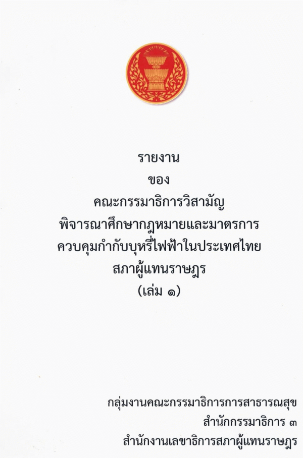 รายงานของคณะกรรมาธิการวิสามัญพิจารณาศึกษากฎหมายและมาตรการควบคุมกำกับบุหรี่ไฟฟ้าในประเทศไทย สภาผู้แทนราษฎร (เล่ม 1) / กลุ่มงานคณะกรรมาธิการการสาธารณสุข สำนักกรรมาธิการ 3 สำนักงานเลขาธิการสภาผู้แทนราษฎร.