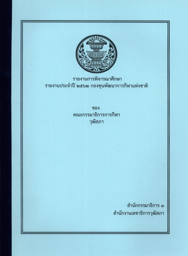 รายงานการพิจารณาศึกษา รายงานประจำปี 2562 กองทุนพัฒนาการกีฬาแห่งชาติ ของคณะกรรมาธิการการกีฬา วุฒิสภา / สำนักกรรมาธิการ 3 สำนักงานเลขาธิการวุฒิสภา.