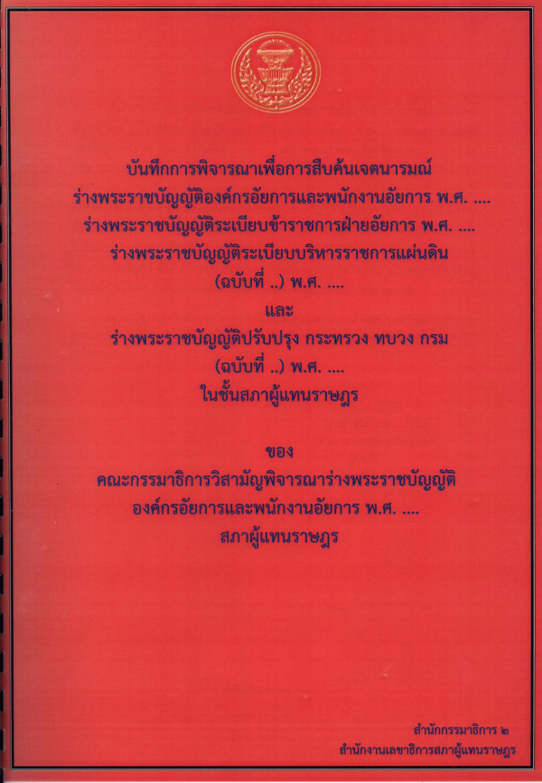 บันทึกการพิจารณาเพื่อการสืบค้นเจตนารมณ์ร่างพระราชบัญญัติองค์กรอัยการและพนักงานอัยการ พ.ศ. .... ร่างพระราชบัญญัติระเบียบข้าราชการฝ่ายอัยการ พ.ศ. .... ร่างพระราชบัญญัติระเบียบบริหารราชการแผ่นดิน (ฉบับที่..) พ.ศ. .... และร่างพระราชบัญญัติปรับปรุง กระทรวง ทบวง กรม ฉบับที่..) พ.ศ. .... ในชั้นสภาผู้แทนราษฎร ของคณะกรรมาธิการวิสามัญพิจารณาร่างพระราชบัญญัติองค์กรอัยการและพนักงานอัยการ พ.ศ. .... สภาผู้แทนราษฎร / สำนักกรรมาธิการ 2 สำนักงานเลขาธิการสภาผู้แทนราษฎร ; วิลาวรรณ ร่ารื่น.