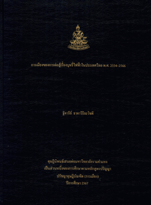 บทที่ 1 บทนำ -- บทที่ 2 แนวคิด ทฤษฎี และงานวิจัยที่เกี่ยวข้อง -- บทที่ 3 วิธีการดำเนินการวิจัย -- บทที่ 4 บริบทและการวิเคราะห์ตัวแสดงแทนทางการเมืองในการต่อสู้ เรื่องบุหรี่ไฟฟ้าในประเทศไทย พ.ศ. 2554-2566 -- บทที่ 5 ปฏิสัมพันธ์ของตัวแสดงแทนทางการเมืองในการต่อสู้เรื่องบุหรี่ไฟฟ้าในประเทศไทย พ.ศ. 2554-2566 -- บทที่ 6 ปัญหาและข้อค้นพบใหม่ของการต่อสู้เรื่องบุหรี่ไฟฟ้าในประเทศไทย พ.ศ. 2554-2566 -- บทที่ 7 สรุปผลการวิจัย การอภิปรายผล และข้อเสนอแนะ.