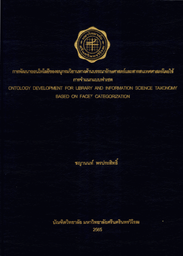 การพัฒนาออนโทโลยีของอนุกรมวิธานทางด้านบรรณารักษศาสตร์และสารสนเทศศาสตร์โดยใช้การจำแนกแบบฟาเซท = Ontology development for library and information science taxonomy based on facet categorization / ชญานนท์ พรประสิทธิ์.