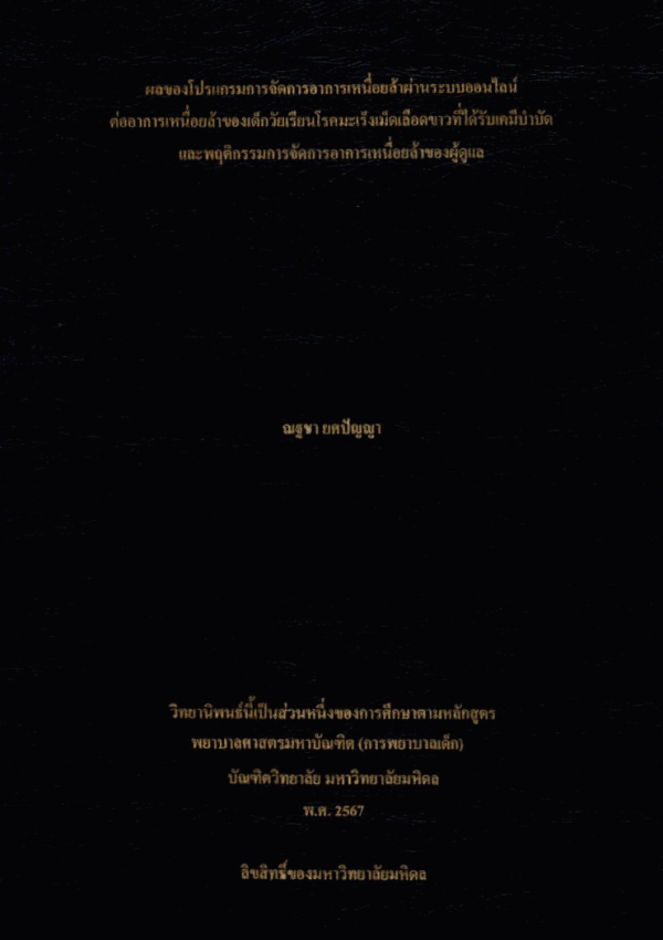 ผลของโปรแกรมการจัดการอาการเหนื่อยล้าผ่านระบบออนไลน์ ต่ออาการเหนื่อยล้าของเด็กวัยเรียนโรคมะเร็งเม็ดเลือดขาวที่ได้รับเคมีบำบัด และพฤติกรรมการจัดการอาการเหนื่อยล้าของผู้ดูแล / ณฐชา ยศปัญญา.