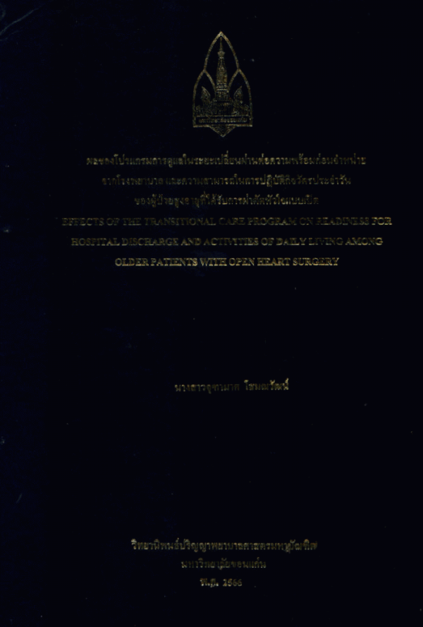 ผลของโปรแกรมการดูแลในระยะเปลี่ยนผ่านต่อความพร้อมก่อนจำหน่ายจากโรงพยาบาล และความสามารถในการปฏิบัติกิจวัตรประจำวันของผู้ป่วยสูงอายุที่ได้รับการผ่าตัดหัวใจแบบเปิด = Effects of the transitional care program on readiness for hospital discharge and activities of daily living among older patients with open heart surgery / จุฑามาศ โสมณวัฒน์.