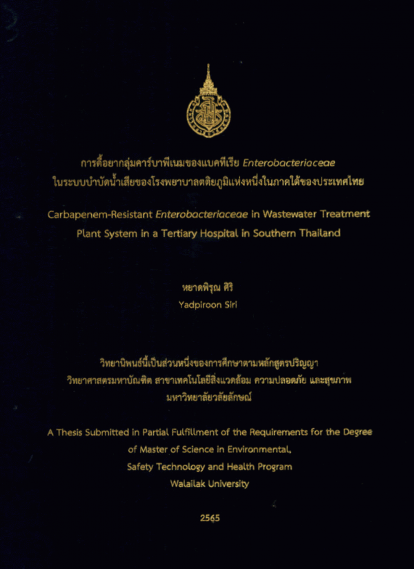 การดื้อยากลุ่มคาร์บาพีเนมของแบคทีเรีย Enterobacteriaceae ในระบบบำบัดน้ำเสียของโรงพยาบาลตติยภูมิแห่งหนึ่งในภาคใต้ของประเทศไทย = Carbapenem-resistant Enterobacteriaceae in wastewater treatment plant system in a tertiary hospital in southern Thailand / หยาดพิรุณ ศิริ.