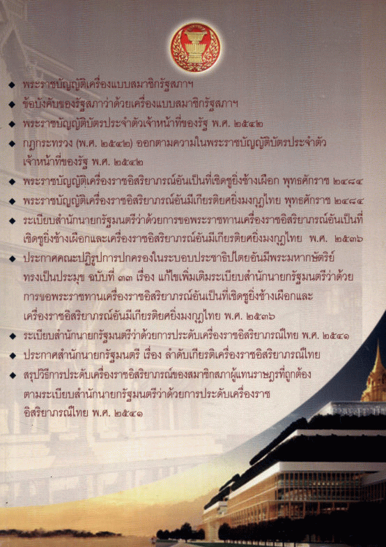 พระราชบัญญัติเครื่องแบบสมาชิกรัฐสภา พ.ศ. 2516 -- พระราชบัญญัติเครื่องแบบสมาชิกรัฐสภา (ฉบับที่ 2) พ.ศ. 2526 -- ข้อบังคับของรัฐสภาว่าด้วยเครื่องแบบสมาชิกรัฐสภา พ.ศ. 2526 -- ข้อบังคับของรัฐสภาว่าด้วยเครื่องแบบสมาชิกรัฐสภา (ฉบับที่ 2) พ.ศ. 2529 -- ข้อบังคับของรัฐสภาว่าด้วยเครื่องแบบสมาชิกรัฐสภา (ฉบับที่ 3) พ.ศ. 2542 -- ข้อบังคับของรัฐสภาว่าด้วยเครื่องแบบสมาชิกรัฐสภา (ฉบับที่ 4) พ.ศ. 2553 -- เครื่องประกอบเครื่องแบบสมาชิกรัฐสภา การแต่งกาย -- พระราชบัญญัติบัตรประจำตัวเจ้าหน้าที่ของรัฐ พ.ศ. 2542 -- กฎกระทรวง (พ.ศ. 2542) ออกตามความในพระราชบัญญัติบัตรประจำตัวเจ้าหน้าที่ของรัฐ พ.ศ. 2542 -- พระราชบัญญัติเครื่องราชอิสริยาภรณ์อันเป็นที่เชิดชูยิ่งช้างเผือก พุทธศักราช 2484 -- พระราชบัญญัติเครื่องราชอิสริยาภรณ์อันมีเกียรติยศยิ่งมงกุฎไทย พุทธศักราช 2484 -- ระเบียบสำนักนายกรัฐมนตรีว่าด้วยการขอพระราชทานเครื่องราชอิสริยาภรณ์อันเป็นที่เชิดชูยิ่งช้างเผือกและเครื่องราชอิสริยาภรณ์อันมีเกียรติยศยิ่งมงกุฎไทย พ.ศ. 2536 -- ประกาศคณะปฏิรูปการปกครองในระบอบประชาธิปไตยอันมีพระมหากษัตริย์ทรงเป็นประมุข ฉบับที่ 33 เรื่อง แก้ไขเพิ่มเติมระเบียบสำนักนายกรัฐมนตรีว่าด้วยการขอพระราชทานเครื่องราชอิสริยาภรณ์อันเป็นที่เชิดชูยิ่งช้างเผือกและเครื่องราชอิสริยาภรณ์อันมีเกียรติยศยิ่งมงกุฎไทย พ.ศ. 2536 -- ระเบียบสำนักนายกรัฐมนตรีว่าด้วยการประดับเครื่องราชอิสริยาภรณ์ไทย พ.ศ. 2541 -- ประกาศสำนักนายกรัฐมนตรี เรื่อง ลำดับเกียรติเครื่องราชอิสริยาภรณ์ไทย -- สรุปวิธีการประดับเครื่องราชอิสริยาภรณ์ของสมาชิกสภาผู้แทนราษฎร ที่ถูกต้องตามระเบียบสำนักนายกรัฐมนตรีว่าด้วยการประดับเครื่องราชอิสริยาภรณ์ไทย พ.ศ. 2541.