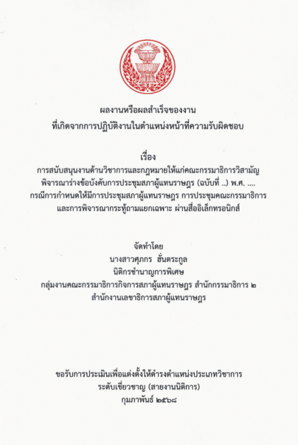 TextPublisher: กรุงเทพฯ : สำนักงานเลขาธิการสภาผู้แทนราษฎร, 2568.Description: 139 หน้า : ตาราง, แผนภูมิ ; 30 ซมOther title: - ผลงานหรือผลสำเร็จของงานที่เกิดจากการปฏิบัติงานในตำแหน่งหน้าที่ความรับผิดชอบ