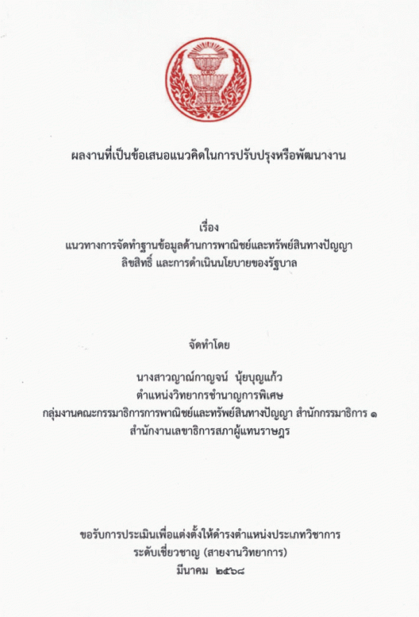 แนวทางการจัดทำฐานข้อมูลด้านการพาณิชย์และทรัพย์สินทางปัญญา ลิขสิทธิ์ และการดำเนินนโยบายของรัฐบาล / ญาณ์กาญจน์ นุ้ยบุญแก้ว.