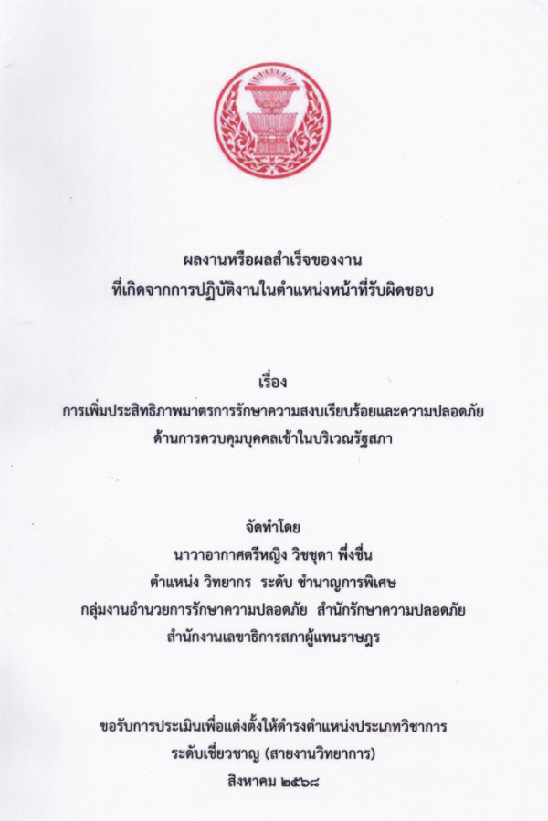 การเพิ่มประสิทธิภาพมาตรการรักษาความสงบเรียบร้อยและความปลอดภัยด้านการควบคุมบุคคลเข้าในบริเวณรัฐสภา / วิชชุดา พึ่งชื่น.
