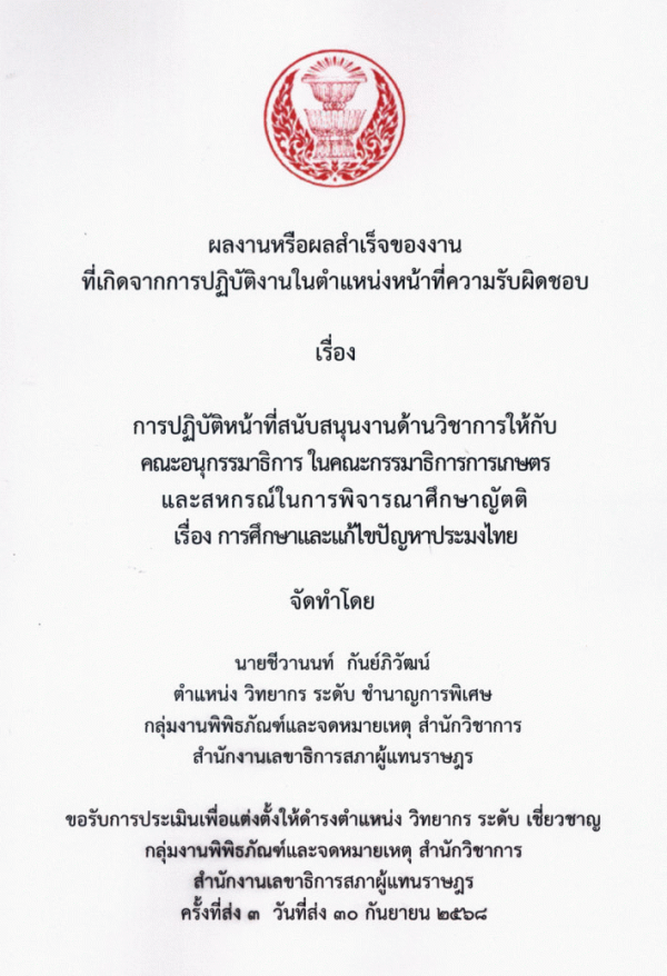 การปฏิบัติหน้าที่สนับสนุนงานด้านวิชาการให้กับคณะอนุกรรมาธิการ ในคณะกรรมาธิการการเกษตรและสหกรณ์ในการพิจารณาศึกษาญัตติ เรื่อง การศึกษาและแก้ไขปัญหาประมงไทย / ชีวานนท์ กันย์ภิวัฒน์.