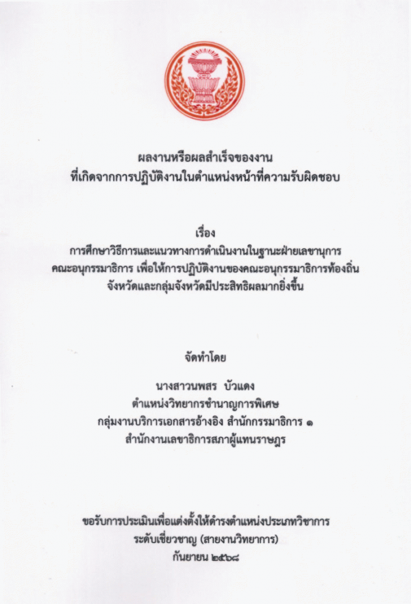 การศึกษาวิธีการและแนวทางการดำเนินงานในฐานะฝ่ายเลขานุการ คณะอนุกรรมาธิการ เพื่อให้การปฏิบัติงานของคณะอนุกรรมาธิการท้องถิ่น จังหวัดและกลุ่มจังหวัดมีประสิทธิผลมากยิ่งขึ้น / นพสร บัวแดง.