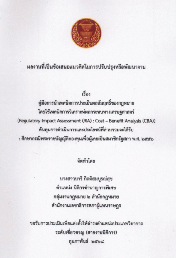 คู่มือการนำเทคนิคการประเมินผลสัมฤทธิ์ของกฎหมายโดยใช้เทคนิคการวิเคราะห์ผลกระทบทางเศรษฐศาสตร์ (Regulatory Impact Assessment (RIA): Cost-Benefit Analysis (CBA)) ต้นทุนการดำเนินการและประโยชน์ที่ส่วนรวมจะได้รับ : ศึกษากรณีพระราชบัญญัติกองทุนเพื่อผู้เคยเป็นสมาชิกรัฐสภา พ.ศ. 2556 / นารี กิตติสมบูรณ์สุข.