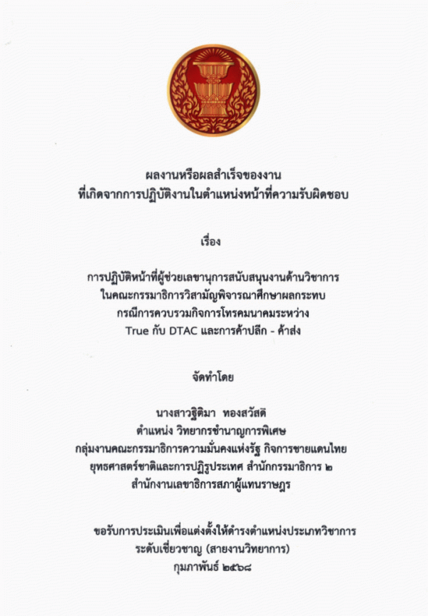 การปฏิบัติหน้าที่ผู้ช่วยเลขานุการสนับสนุนงานด้านวิชาการ ในคณะกรรมาธิการวิสามัญพิจารณาศึกษาผลกระทบ กรณีการควบรวมกิจการโทรคมนาคมระหว่าง True กับ DTAC และการค้าปลีก - ค้าส่ง / ฐิติมา ทองสวัสดิ์.