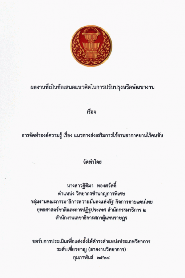 การจัดทำองค์ความรู้ เรื่อง แนวทางส่งเสริมการใช้งานอากาศยานไร้คนขับ / ฐิติมา ทองสวัสดิ์.