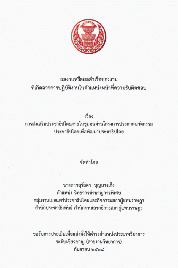 การส่งเสริมประชาธิปไตยภายในชุมชนผ่านโครงการประกวดนวัตกรรมประชาธิปไตยเพื่อพัฒนาประชาธิปไตย / สุรัสดา บุญบางเก็ง.