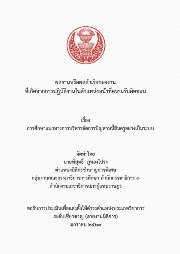 การศึกษาแนวทางการบริหารจัดการปัญหาหนี้สินครูอย่างเป็นระบบ / พิสุทธิ์ ภูทองโปร่ง.