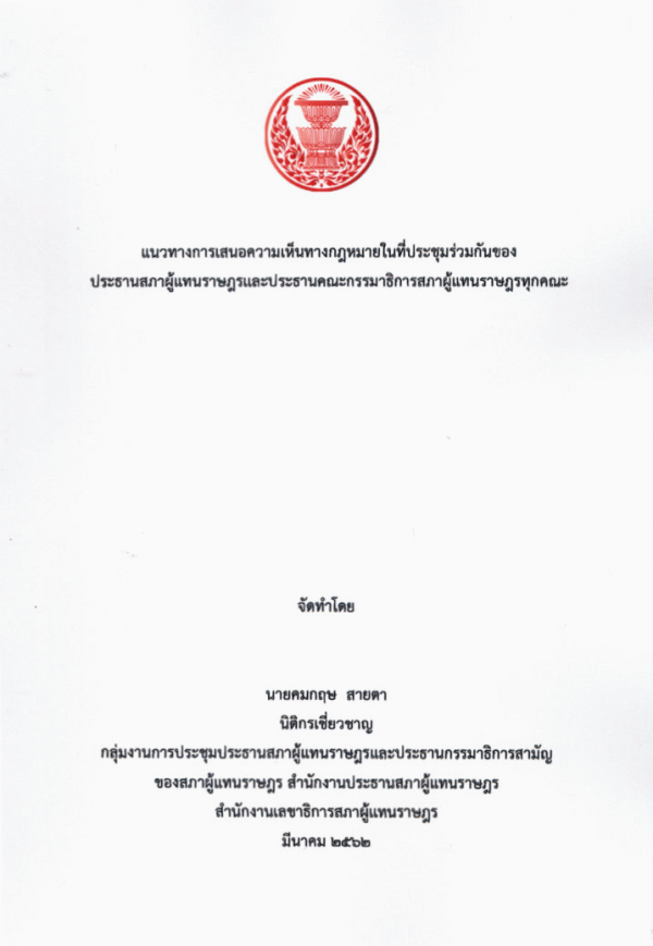 แนวทางการเสนอความเห็นทางกฎหมายในที่ประชุมร่วมกันของประธานสภาผู้แทนราษฎรและประธานคณะกรรมาธิการสภาผู้แทนราษฎรทุกคณะ / คมกฤษ สายตา.