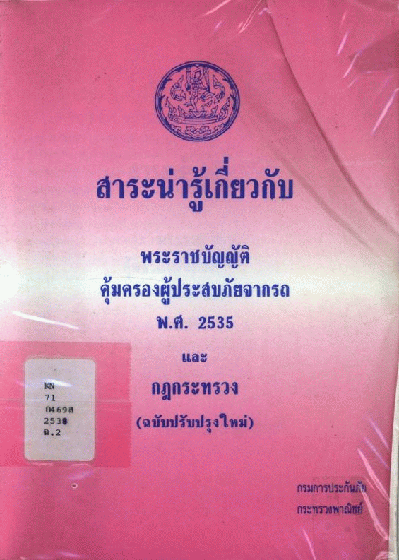 สาระน่ารู้เกี่ยวกับพระราชบัญญัติคุ้มครองผู้ประสบภัยจากรถ พ.ศ.2535 และกฎกระทรวง (ฉบับปรับปรุงใหม่) / กองวิชาการและสถิติ กรมการประกันภัย.