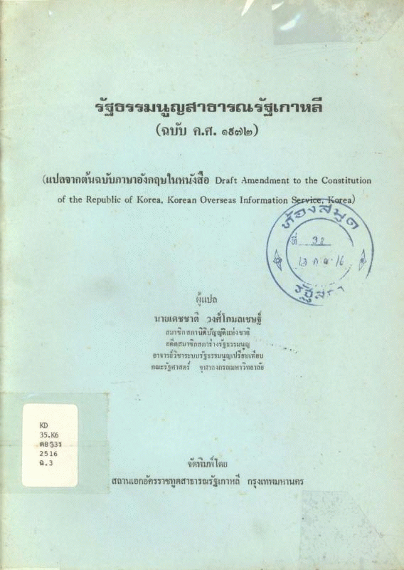 รัฐธรรมนูญสาธารณรัฐเกาหลี (ฉบับ ค.ศ.1972) / เดชชาติ วงศ์โกมลเชษฐ์, ผู้แปล.