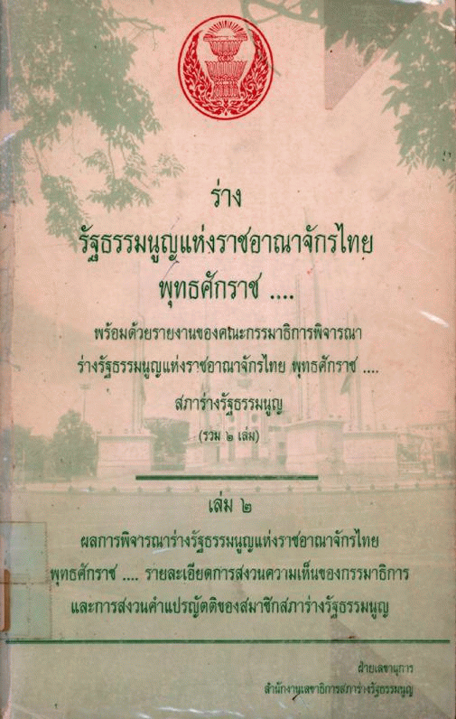 ร่างรัฐธรรมนูญแห่งราชอาณาจักรไทย พุทธศักราช...พร้อมด้วยรายงานของคณะกรรมธิการพิจารณาร่างรัฐธรรมนูญแห่งราชอาณาจักรไทย พุทธศักราช... สภาร่างรัฐธรรมนูญ เล่ม 2