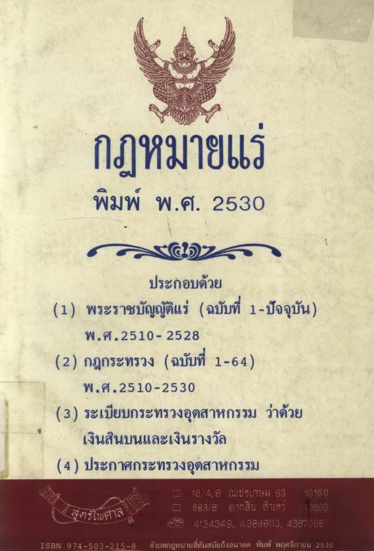 National Assembly Library of Thailand | Law Book collection | KL 47 ส886ก 2530 (เรียกดูชั้นหนังสือ(เปิดด้านล่าง)) | พร้อมให้บริการ | 3961134312 |