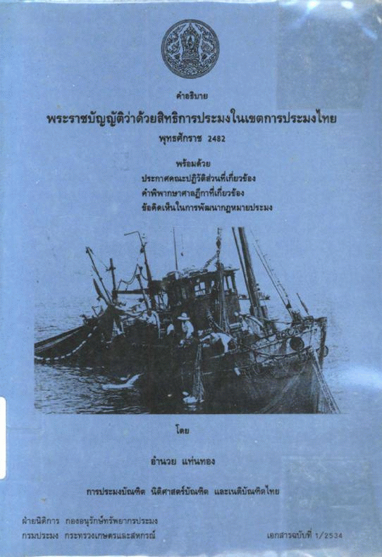 คำอธิบายพระราชบัญญัติว่าด้วยสิทธิการประมงในเขตการประมงไทย พุทธศักราช 2482 พร้อมด้วยประกาศคณะปฏิวัติส่วนที่เกี่ยวข้อง คำพิพากษาศาลฎีกาที่เกี่ยวข้อง ข้อคิดเห็นในการพัฒนากฎหมายประมง