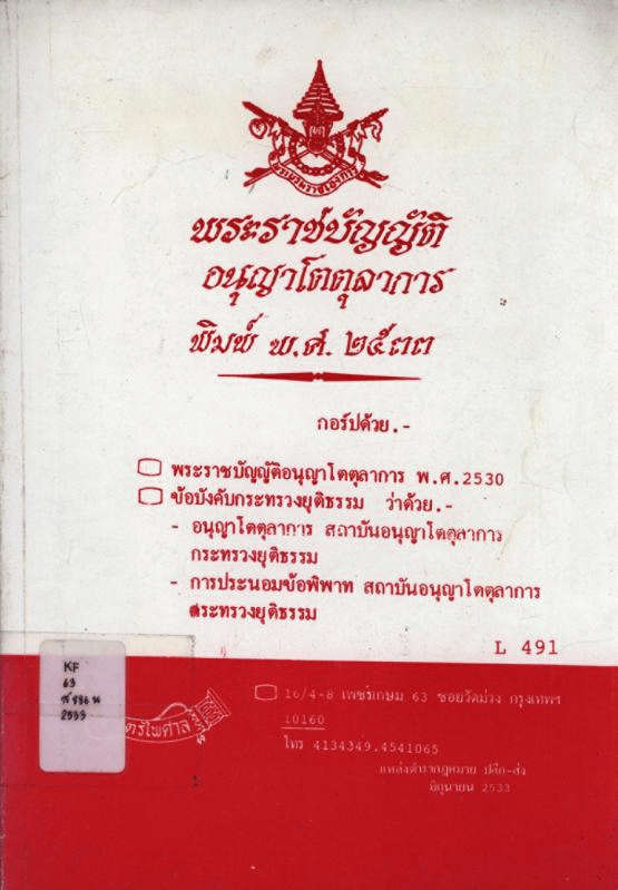 National Assembly Library of Thailand | Law Book collection | KF 63 ส886พ 2533 (เรียกดูชั้นหนังสือ(เปิดด้านล่าง)) | พร้อมให้บริการ | 3961126572 |