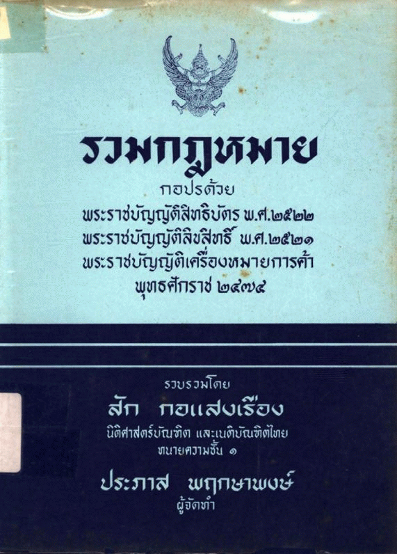รวมกฎหมาย กอปรด้วยพระราชบัญญัติสิทธิบัตร พ.ศ.2522 พระราชบัญญัติลิขสิทธิ์ พ.ศ.2521 พระราชบัญญัติเครื่องหมายการค้า พุทธศักราช 2474