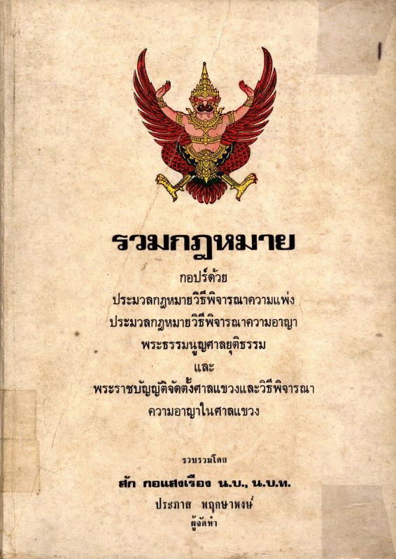 รวมกฎหมาย กอปร์ด้วยประมวลกฎหมายวิธีพิจารณาความแพ่ง ประมวลกฎหมายวิธีพิจารณาความอาญา พระธรรมนูญศาลยุติธรรม และพระราชบัญญัติจัดตั้งศาลแขวงและวิธีพิจารณาความอาญาในศาลแขวง