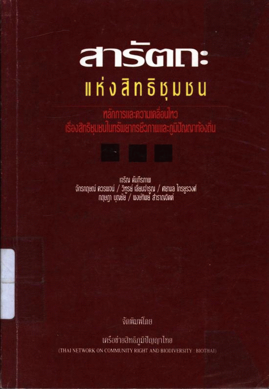 สารัตถะแห่งสิทธิชุมชน : หลักการและความเคลื่อนไหวเรื่องสิทธิชุมชนในทรัพยากรชีวภาพ และภูมิปัญญาท้องถิ่น.