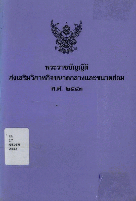 - ส่งเสริมวิสาหกิจขนาดกลางและขนาดย่อม (พ.ร.บ.) -- 2543วิสาหกิจขนาดกลางและขนาดย่อม -- กฎหมายและระเบียบข้อบังคับธุรกิจขนาดกลางและขนาดย่อม -- กฎหมายและระเบียบข้อบังคับ