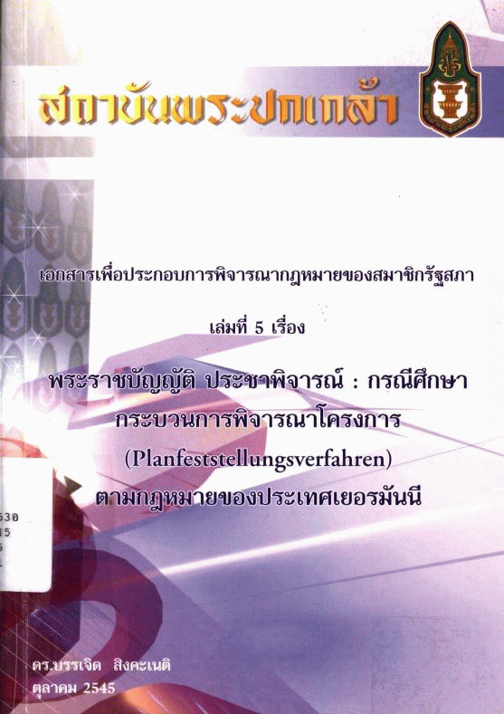 เอกสารเพื่อประกอบการพิจารณากฎหมายของสมาชิกรัฐสภา เล่มที่ 5 เรื่อง พระราชบัญญัติประชาพิจารณ์ : กรณีศึกษากระบวนการพิจารณาโครงการ (Planfeststellungsverfahren) ตามกฎหมายของประเทศเยอรมันนี