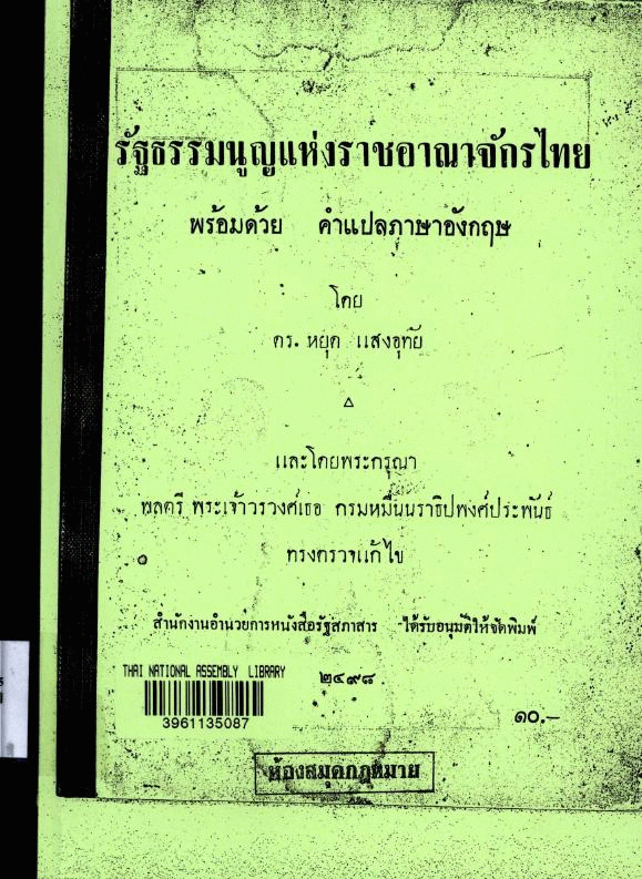 รัฐธรรมนูญแห่งราชอาณาจักรไทย พร้อมด้วยคำแปลภาษาอังกฤษ / โดย หยุด แสงอุทัย ; และโดยพระกรุณา พลตรี พระเจ้าวรวงศ์เธอ กรมหมื่นนราธิปพงศ์ประพันธ์ ทรงตรวจแก้ไข.