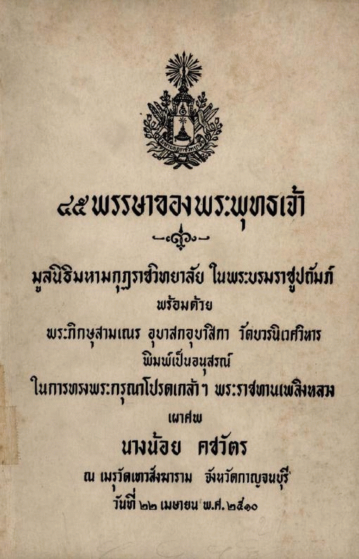 มูลนิธิมหามกุฏราชวิทยาลัย ในพระบรมราชูปถัมภ์ พร้อมด้วยพระภิกษุสามเณร อุบาสกอุบาสิกา วัดบวรนิเวศวิหาร พิมพ์เป็นอนุสรณ์ในการทรงพระกรุณาโปรดเกล้าฯ พระราชทานเพลิงหลวงเผาศพ นางน้อย คชวัตร ณ เมรุวัดเทวสังฆาราม จังหวัดกาญจนบุรี วันที่ 22 เมษายน พ.ศ. 2510