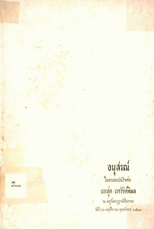 National Assembly Library of Thailand | Cremation collection | Cremation corner | อศ ส765ก 2513 (เรียกดูชั้นหนังสือ(เปิดด้านล่าง)) | พร้อมให้บริการ | 3961115858 |