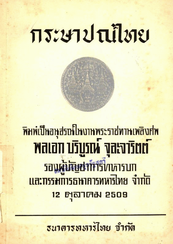 พิมพ์เป็นอนุสรณ์ในงานพระราชทานเพลิงศพ พลเอก บริบูรณ์ จุละจาริตต์ รองผู้บัญชาการทหารบกและกรรมการธนาคารทหารไทย จำกัด 12 ตุลาคม 2509