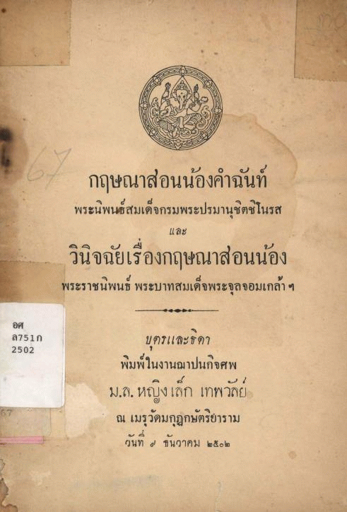 National Assembly Library of Thailand | Cremation collection | Cremation corner | อศ ล751ก 2502 (เรียกดูชั้นหนังสือ(เปิดด้านล่าง)) | พร้อมให้บริการ | 3961117625 |