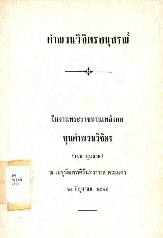 National Assembly Library of Thailand | Cremation collection | Cremation corner | อศ ค356ค 2514 (เรียกดูชั้นหนังสือ(เปิดด้านล่าง)) | พร้อมให้บริการ | 3961132182 |