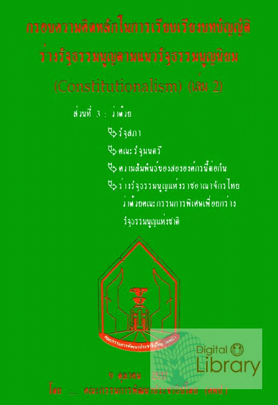 กรอบความคิดหลักในการเรียบเรียงบทบัญญัติร่างรัฐธรรมนูญตามแนวรัฐธรรมนูญนิยม (Constitutionalism) (เล่ม 2) ส่วนที่ 3 ว่าด้วยรัฐสภา คณะรัฐมนตรี ความสัมพันธ์ของสององค์กรนี้ต่อกัน ว่าด้วยคณะกรรมการพิเศษเพื่อยกร่างรัฐธรรมนูญแห่งชาติ / คณะกรรมการพัฒนาประชาธิปไตย (คพป.) สภาผู้แทนราษฎร.