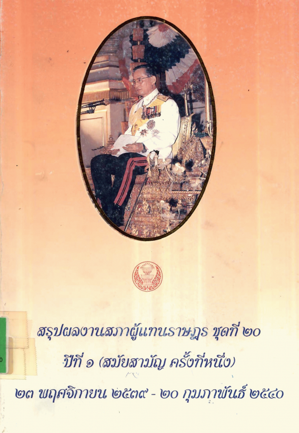 สรุปผลงานสภาผู้แทนราษฎร ชุดที่ 20 ปีที่ 1 (สมัยสามัญ ครั้งที่หนึ่ง) 23 พฤศจิกายน 2539-20 กุมภาพันธ์ 2540 / กองการประชาสัมพันธ์ สำนักงานเลขาธิการสภาผู้แทนราษฎร.