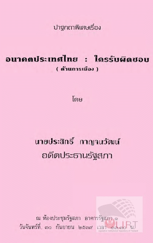 ปาฐกถาพิเศษเรื่อง อนาคตประเทศไทย : ใครรับผิดชอบ (ด้านการเมือง) / สำนักประชาสัมพันธ์ สำนักงานเลขาธิการสภาผู้แทนราษฎร.