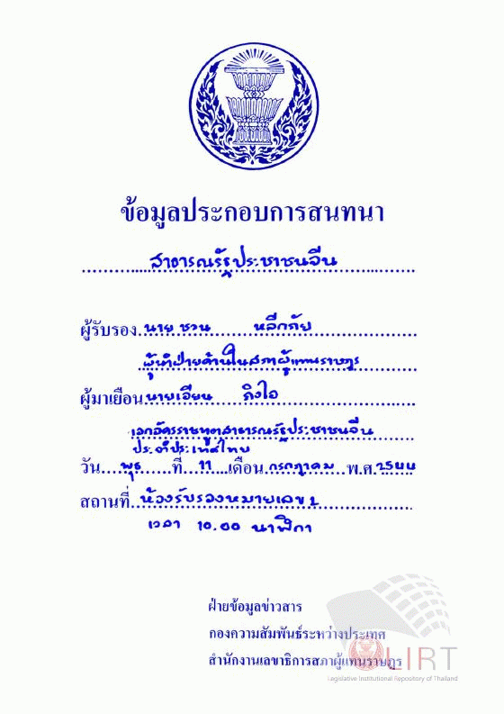 ข้อมูลสาธารณรัฐประชาชนจีน นายเอียน ถิงไอ เอกอัครราชทูตสาธารณรัฐประชาชนจีนประจำประเทศไทย เข้าเยี่ยมคารวะ นายชวน หลีกภัย .... / กองความสัมพันธ์ระหว่างประเทศ สำนักงานเลขาธิการสภาผู้แทนราษฎร.
