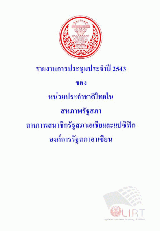 รายงานการประชุมประจำปี 2543 ของหน่วยประจำชาติไทยในสหภาพรัฐสภา สหภาพสมาชิกรัฐสภาเอเชียและแปซิฟิก องค์การรัฐสภาอาเซียน / กององค์การรัฐสภาระหว่างประเทศ สำนักงานเลขาธิการสภาผู้แทนราษฎร.