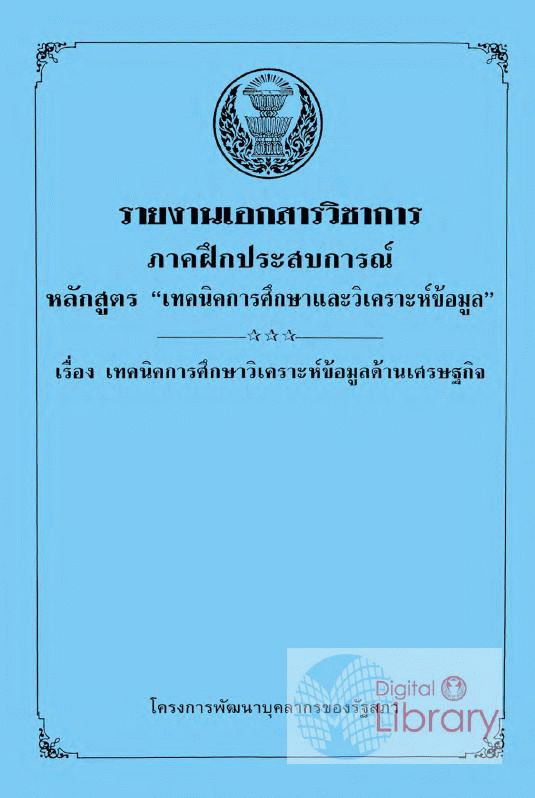 รายงานเอกสารวิชาการภาคฝึกประสบการณ์หลักสูตร "เทคนิคการศึกษาและวิเคราะห์ข้อมูล" เรื่อง เทคนิคการศึกษาวิเคราะห์ข้อมูลด้านเศรษฐกิจ / สำนักพัฒนาบุคลากร สำนักงานเลขาธิการสภาผู้แทนราษฎร.